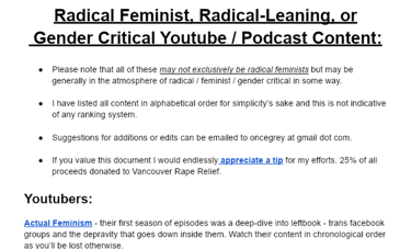 Radical Feminist, Rad Leaning, or Gender Critical Youtube/Podcast Masterdoc